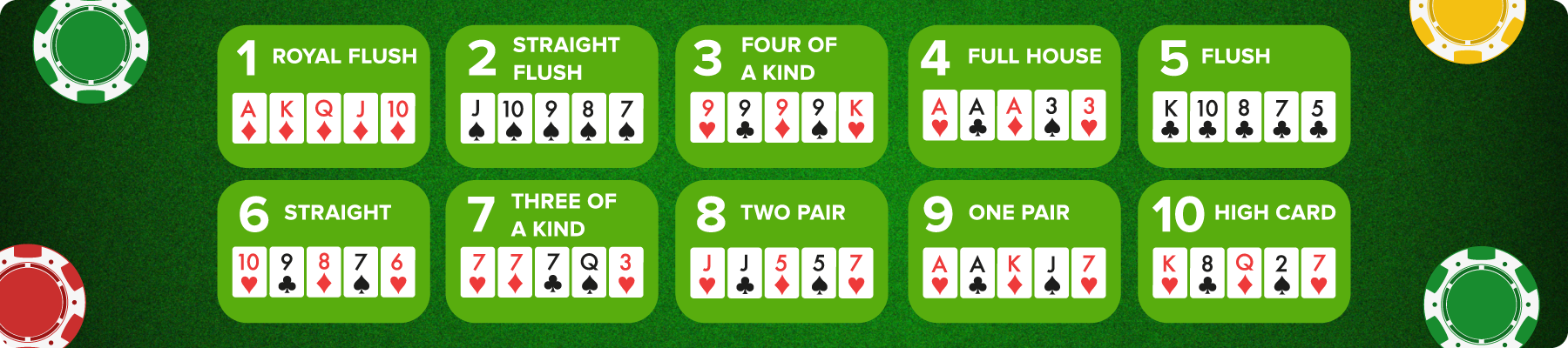 Здесь мы расположим десять основных покерных комбинаций от самых сильных до самых слабых.